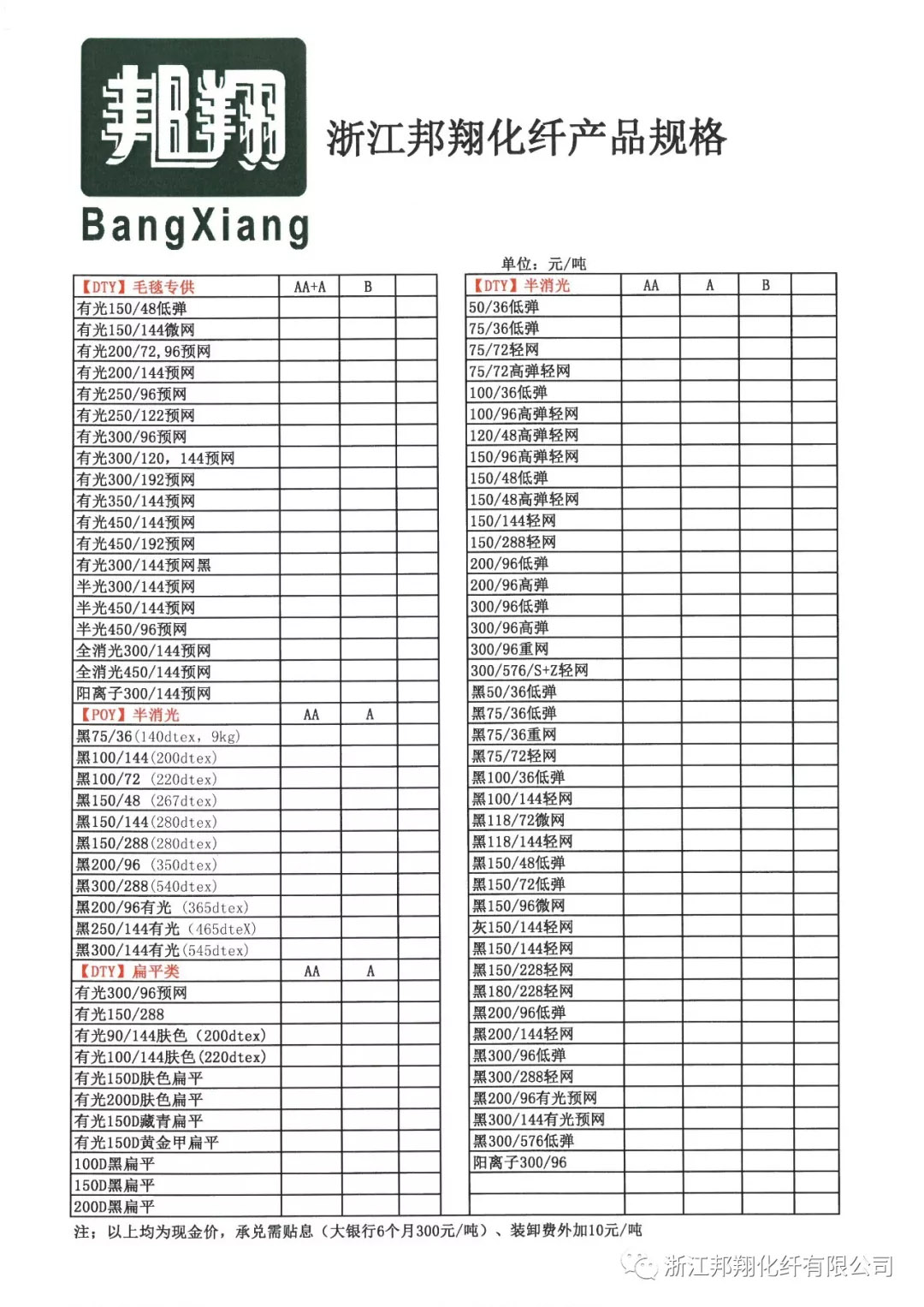 ตารางข้อมูลจำเพาะของผลิตภัณฑ์ Zhejiang Bangxiang Holding Group-รายการผลิตภัณฑ์